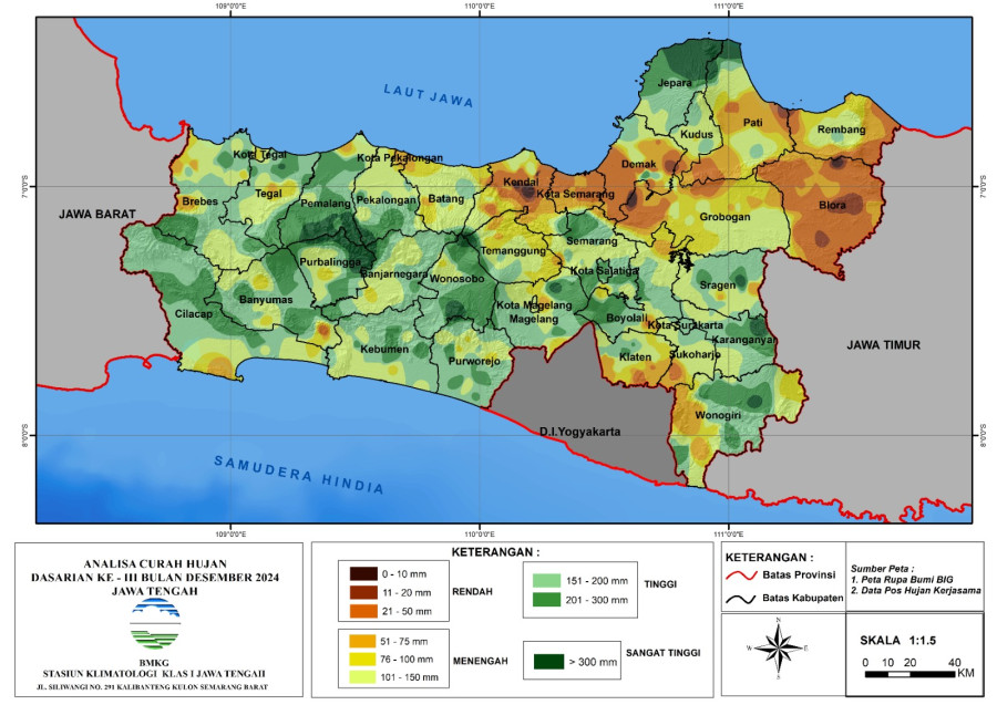 Dasarian I Januari 2025 : Sebagian besar wilayah Jawa Tengah masuk kriteria Menengah hingga Tinggi (151 – 300 mm). Sedangkan sebagian Rembang diprakirakan curah hujan 21 – 50 mm (kriteria Rendah)